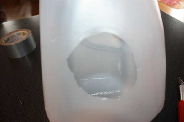 Corte un agujero en el jarro de leche y un pequeño agujero en la tapa.