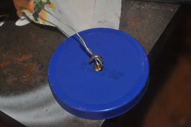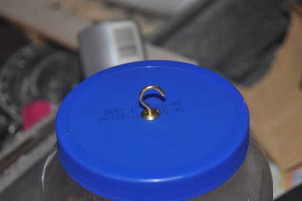 Utilizar el pedacito de taladro pequeño y perfore un agujero en la parte superior de la jarra de mantequilla de maní. Ahora le falta el gancho de latón, así que deja de pretender ser un pirata y tornillo en el agujero. Ahora, no sé ustedes, pero si yo fuera un pájaro, no me gustaría ser apuñalado por un tornillo puntiagudo, entonces, hacer lo correcto, cubrirla con sugru o incluso caliente pegamento. Ahora, vuelva a enroscar la tapa.