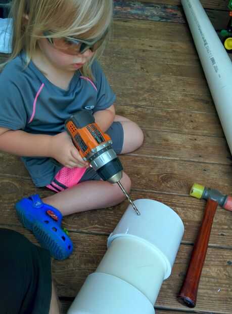 Utilizando las 3/16" broca y taladro (mi"tamaño Lily"12V compacto taladro en este caso), realizar dos agujeros en la misma línea de centro de la tubería, aproximadamente una pulgada desde el interior borde del acople y tapa.