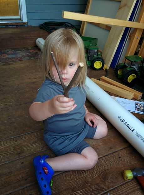 Utilizando un trozo de espiga 5/16" crear e instalar la perca. Mi hija decidió utilizar un palo, porque eso es lo que sientan en los birdies cuando están en los árboles. Encontramos un buen tamaño palo bifurcado para que el ave mamá y papá tanto le tiene un lugar para sentarse. Usando un cuchillo jamonero redujo el extremo de la vara hasta el tamaño adecuado a la cuña en su agujero de montaje.
