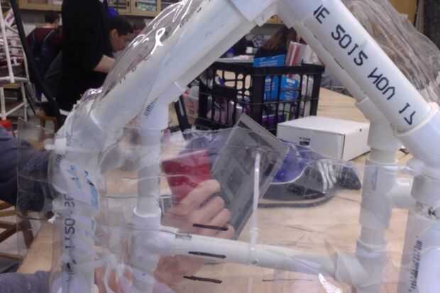 para el techo necesita conectores de grado de cuatro 45, dos conectores de salida lateral de 90 grados, 4 tubos de cuatro pulgadas y un tubo de 3,5 pulgadas. tomar los conectores cuatro 40 grados y colocar en la parte superior de los tubos que no tienen nada en ellos. luego tomar la 4 cuatro pulgadas tubos y poner uno en cada conector de 45 grados. Conecte las tuberías de 4 pulgadas con un conector de salida lateral de 90 grados. para terminar el techo que el uno de 3.5 pulgadas en los conectores en la parte superior