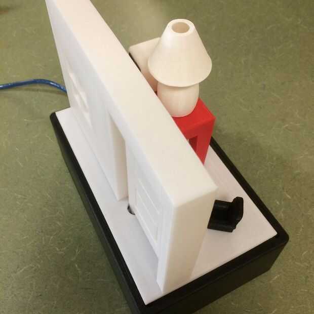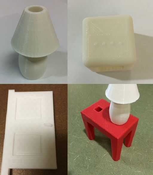 Creé los modelos de lámpara, radio, puertas y mesa en Autodesk Inventor. Luego 3D impreso en un Makerbot Replicator.