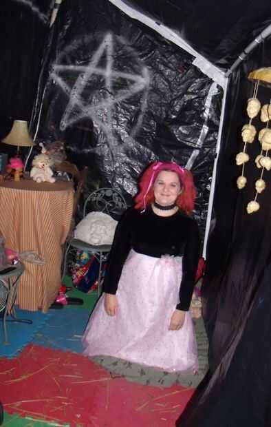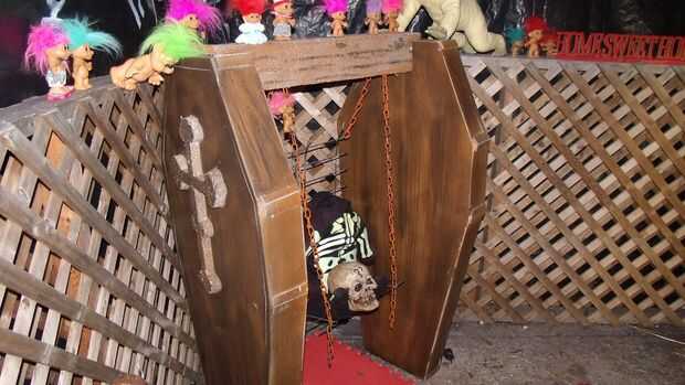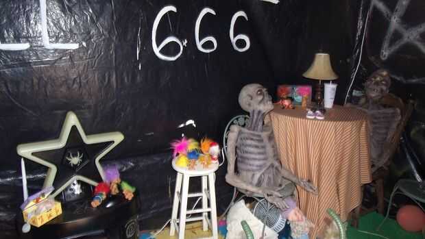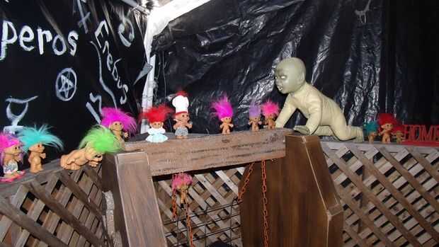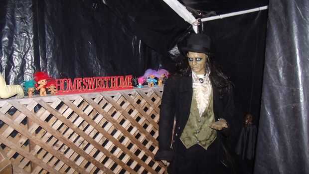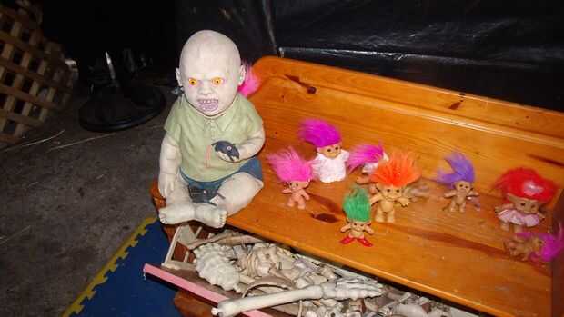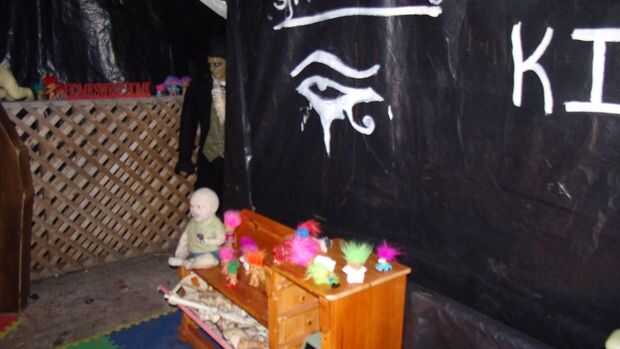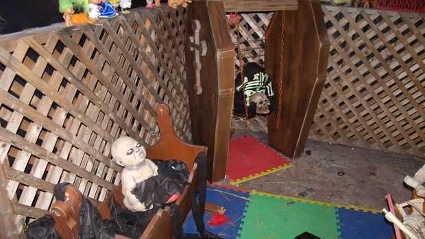 La guardería del demonio puede ser la habitación más discutida, no debido a su miedo, su más escalofriante que da miedo pero porque mi nieto de 7 meses de edad es parte de ella. Con ambos padres siendo actores y no niñera diseñamos esta habitación con el bebé en mente y le encanta! La mayoría de los muebles aquí es frenar rescate y entonces allí es mi swing de bebé de ataúd que se puede ver el principio de en la viga superior es simplemente tallada icopor, la oscilación es de una pantalla aire acondicionado desechados y la cadena se envuelve alrededor de un pedazo de palo de escoba, swing pero no motorizado. Arrastran todo el mayordomo y suspiras de alivio es la salida!