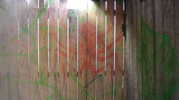Dejando el susto de ataúd que camina por un pasillo cubierto cortina iluminado con luz estroboscópica y luces negras, una araña calavera fluorescente está pintada en la pared lateral y otro corto pasillo que lleva al siguiente susto