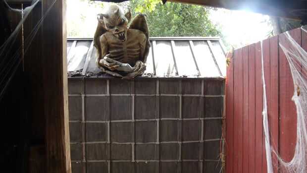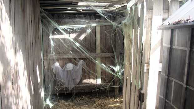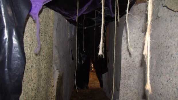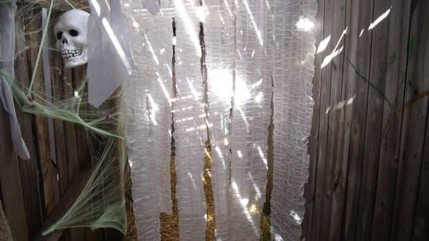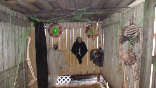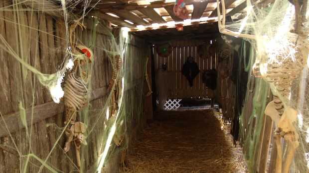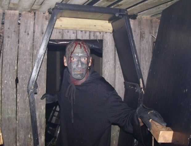 Hasta la sala del cráneo nuestros clientes están solos, en la sala de cráneo que recogen una guía, una vez fuera de la zona final de resto los sustos empezar, 1 º ves a uno de mi almacenamiento arroja la pared con un demonio odiosas abajo en usted y luego en un esqueleto y telaraña pasillo alineado con uno o 2 actores, de ahí su en un oscuro túnel cuyas paredes acolchadas con alfombra reciclada relleno que ha sido remojada con agua , algunos cordeles embalaje cuelga del techo y también está mojado. Más allá del túnel oscuro es una pequeña habitación con un ataúd del dedo del pie-pincher mi hijo construyó hace años como nuestra puerta de entrada, este año aparece abierto y un actor salta.