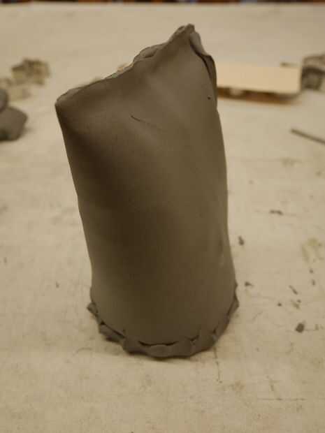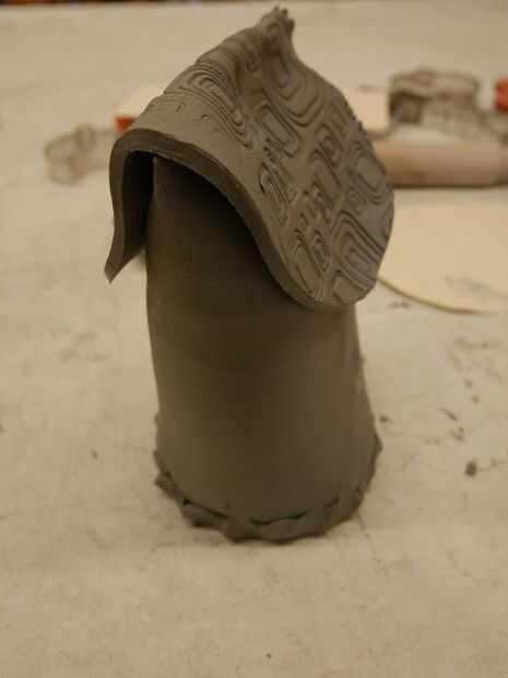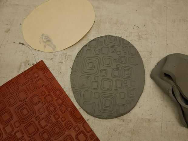rodar una losa de barro para cortar forma ovalada 6 "X 7", apreto un patrón en mi arcilla como viejas tejas.