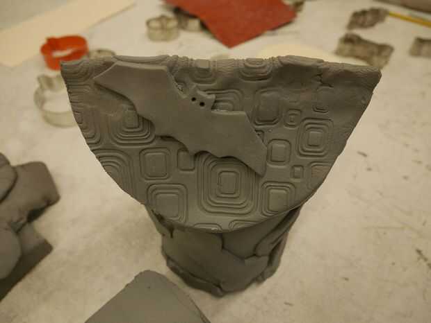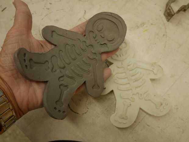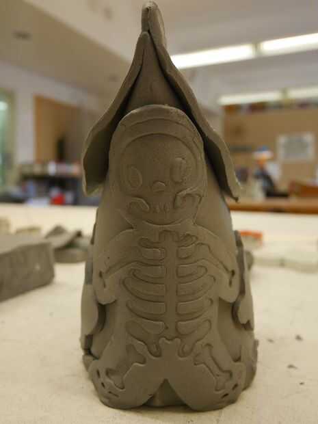 rollo más losas de arcilla y utilice su cortador de galletas para cortar varias formas para decorar la casa... Usé algunos huesos y un esqueleto para colocar alrededor de la base