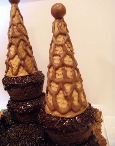 Apoderarse del bolso de la izquierda se funde el chocolate con leche que usted ha utilizado anteriormente en los conos. Si es necesario, ablandar el chocolate una vez más en el microondas durante 30 segundos o menos. Dibuja un círculo de chocolate en cada uno de los cupcakes de top 3 y pegue los conos en la azotea para cada una de ellas.