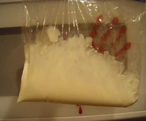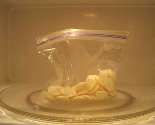 Meter la bolsa en el microondas y ponerlo en 1 minuto. Esto debería ser tiempo suficiente para fundir el chocolate. Tomar un par de tijeras y cortar uno de los rincones de, no es mucho! Lo suficiente como para realizar algún trabajo de detalle.