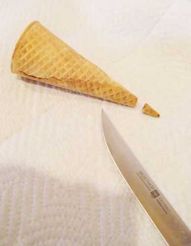 Para hacer los tejados, coge 3 conos de azúcar y un cuchillo.