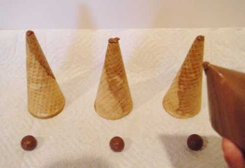 Una vez que tiene fundido, tubería a un punto en la parte superior de cada cono y pega un whopper. Ponerlos en el refrigerador se enfríe rápidamente y completamente el pegamento el whopper al cono.