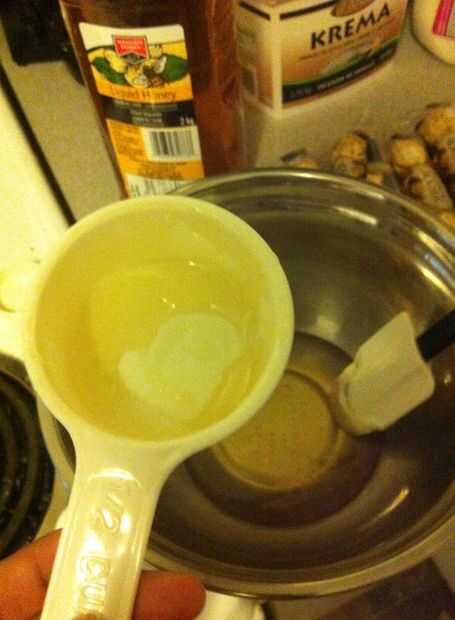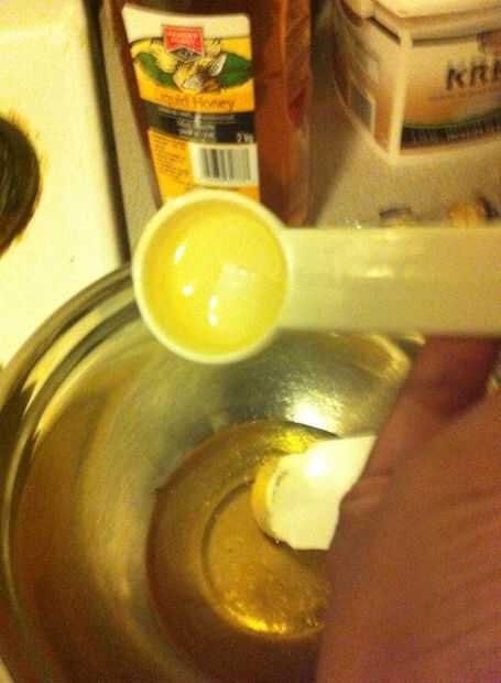 Tomar el recipiente y su miel, me gusta usar 3 (1/2 tazas) miel y luego 3 cucharadas de miel.