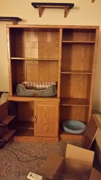 Entonces quité todo de la forma de estantes las secciones externas y desenroscar los estantes de la puerta desde el interior sección. Taladré un agujero en el centro de uno de los mejores agujeros (con una broca en la dremel) fijar el accesorio de corte de orificio orificio de 9 pulgadas de diámetro, la profundidad de bits y corte un orificio de prueba. I lijar los bordes y luego uno de mis gatos se sentaron en la plataforma al lado del agujero y había obligado le a través de un placer en el otro lado. No hay problemas.
