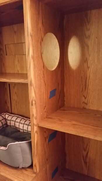 Cargué un router de corte de madera del pedacito en la Dremel establece la profundidad de corte adecuada, fijar el accesorio de corte del agujero para cortar un círculo de diámetro de 9 pulgadas y luego ajuste la herramienta a una velocidad bastante alta. Encendí el Dremel, presiona el centro de la herramienta en el agujero previamente perforados y lentamente hundió la broca de fresadora en la madera. Va poco a poco me fui hacia la derecha alrededor de la circunferencia del agujero. Vaya lentamente aquí como intentar ir rápido puede quemar hasta las brocas de router e incluso romperlos. Lije el borde del agujero para evitar posiblemente hiriendo a sus gatos. Repita este proceso para los orificios restantes.