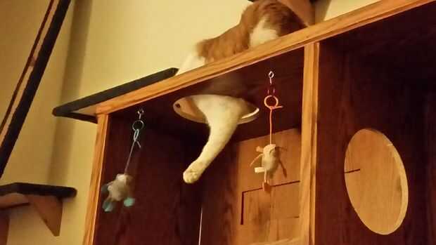 Hemos diseñado estos estantes y casa gato montado en la pared como un regalo para mi hermano y su novia o más exactamente su gato Moe.Moe le gusta casillas y lugares altos. Mi hermano y su novia querían un lugar para almacenar sus favoritos libros y