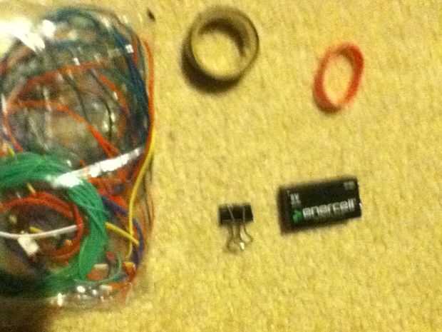Eléctrica y o conducto cinta una alarma o zumbador (encontrado en un RadioShack local) papel dos clips a un clip chip o ropa pin cable de conexión con diferentes longitudes A 9 voltios la masa algo para sostener el cable a la batería y una tarjeta de mesa cuadrada