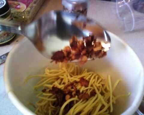 Era capaz de caber en un poco más de 2 onzas de fideos sin aplastarlos demasiado (lo cual es importante si desea más más en tacto fideos)
