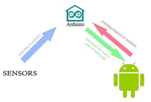 Al hacer clic en actualizar en su aplicación o en navegador Arduino envía datos al smartphone y navegadores. Aplicación obtiene el código fuente de cada página (/ tempin, /tempout, /rain, /window, alarma) y muestra en su teléfono.