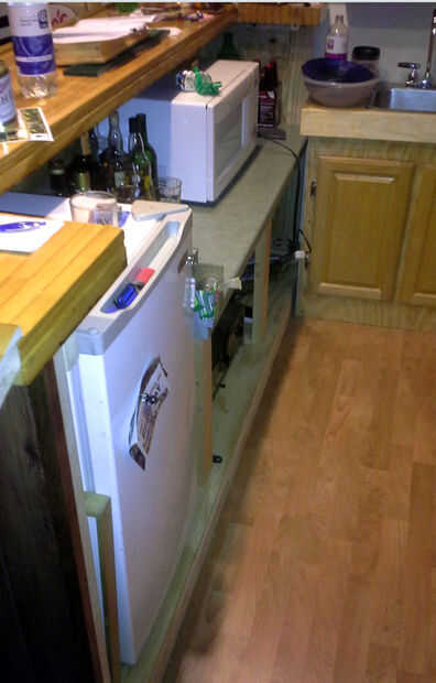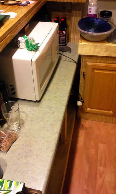 Se puede ver en estas fotos que ya no tengo el estante de madera contrachapada. Compré un trozo de encimera para el estante. Córtelo a la longitud y profundidad usando mi sierra circular. Sólo colóquelo en la madera contrachapada y las ayudas y había sujetado en su lugar con tornillos de madera de abajo.