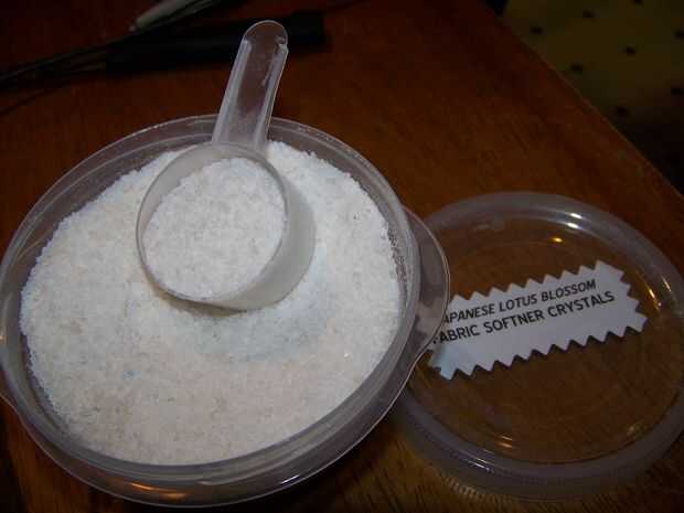 Almacenar en un pequeño vaso de plástico o bolsa. Utilizamos café reciclado o los botes de yogur, algo con una tapa que no deja todo el olor del aceite se evaporan. Utilice como desee para el suavizante. usamos una cucharada 1 cucharada reciclada de la lata de oxi-clean.