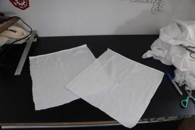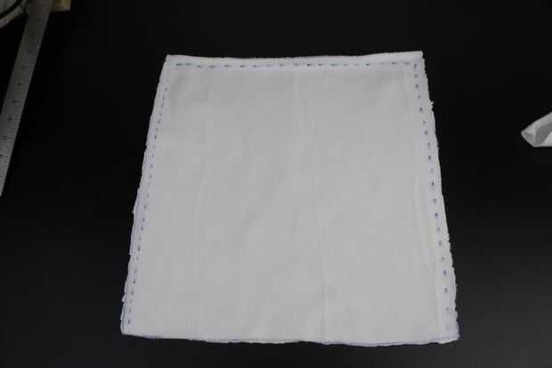 Cortar la tela en dos pedazos iguales, de aproximadamente 40 cm x 40 cm. Poner los dos pedazos de tela por la parte de atrás (la parte delantera quedara por dentro) y marcar tres de los lados para coser, puede ser una mano o a maquina, yo lo hice a mano es un poco mas tardado pero igual funciona.