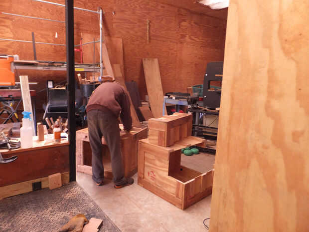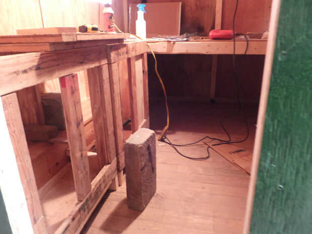 entonces el frente fueron recortar espacios, madera contrachapada fue cortada para caber en los espacios como puertas e instalamos bisagras gabinete. quitar las tapas del cajón y colocar en medio de los cajones de la madera contrachapada y tablero de madera dura en la otra mitad. más sobre los gabinetes / cocina más adelante.