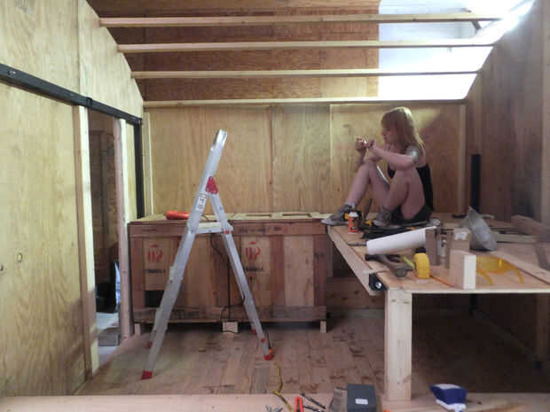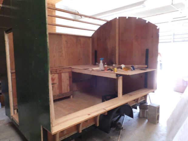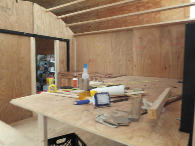 mi remolque es de 9 pies de largo de pared frontal a la pared posterior, las vigas del techo son 10'6 '' largo porque mi techo tiene un saliente en la parte posterior.