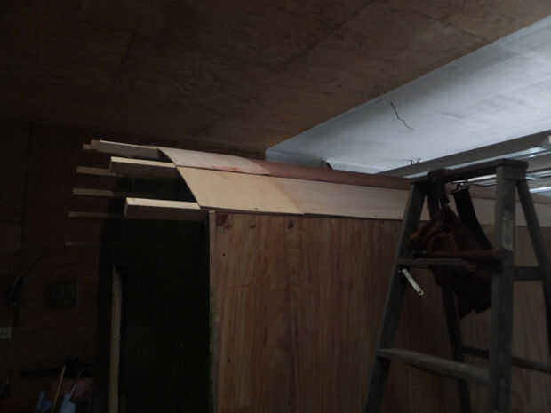 Ahora usted puede poner en el techo. se puede utilizar 1/4 '' madera contrachapada o luan. He utilizado luan y parece tener bien. Cuando vayas a poner en, desde una de las paredes y agujeros en cada esquina. Fije con clavos para techo. doblar sobre tan plano como sea posible, asegurando otra vez en el centro y otra vez en los rincones. cada techo será diferente, pero uso como pocos clavos como sea posible, no quiere entrar en el camino más adelante al tornillo en el techo.