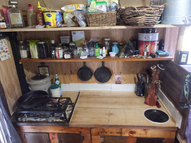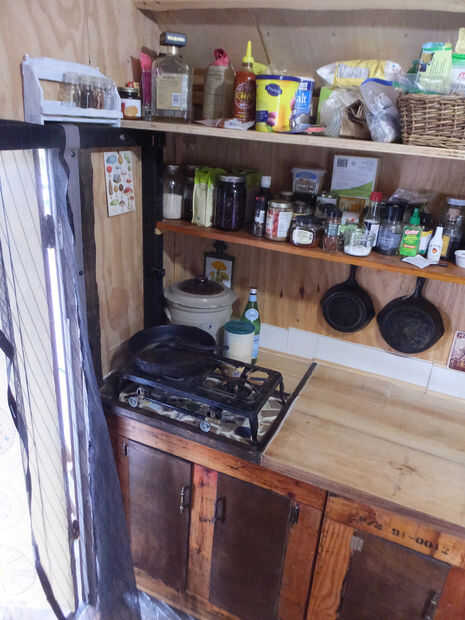 ESTUFA: conseguimos una movible de hierro fundido, dos asunto de quemador para bastante barato en línea. conecta a un tanque de propano pequeño afuera, se sienta en el 'borde'. la manguera se llega a través de un agujero en la cornisa y otro agujero en la encimera y ganchos a la estufa. podría hacer la misma configuración con una parrilla de tipo coleman, sólo tienes que comprar su cosa de accesorio regulador especial para utilizar esas estufas con un cilindro de gas LP adecuado. Almacenamos el cilindro en el cuadro de la lengua cuando no esté en uso.