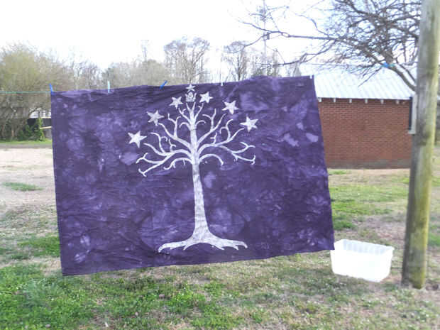 Hice un toldo de lona que se acopla a ganchos fuera. Esto hace que un porche de lado o cocina al aire libre en verano. sí, me batik-ed con el árbol de Gondor.