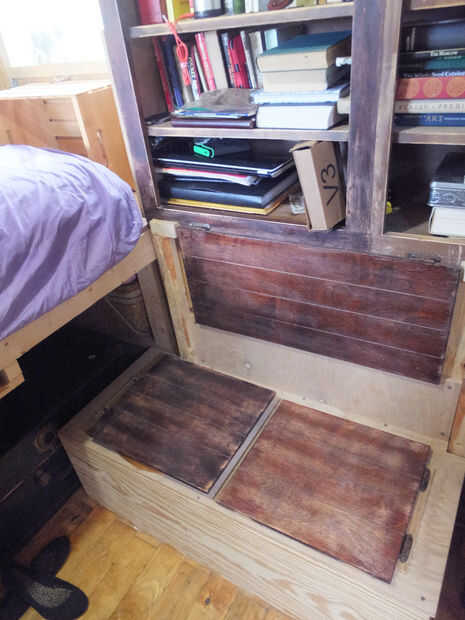 CAMA: es un futón que me hice, y es el mejor sueño que IV tenido. es una lona pesada concha con capas de vieja acolchados de espuma, colchones, mantas, etc. simple. almacenar voluminosos invierno edredón y sábanas en la cama!