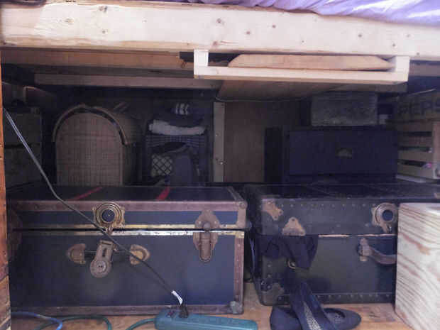 ALMACENAMIENTO: ver fotos. mayoría de los artículos debajo de la cama. despensa = estantes sobre cocina, gabinetes = platos y almacenamiento del aparato. neumático de repuesto en la caja de la lengua, elementos ligeros pero voluminosos colgaron de vigas.