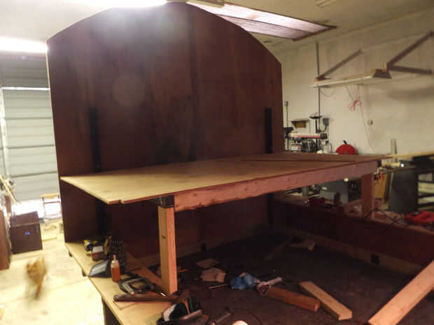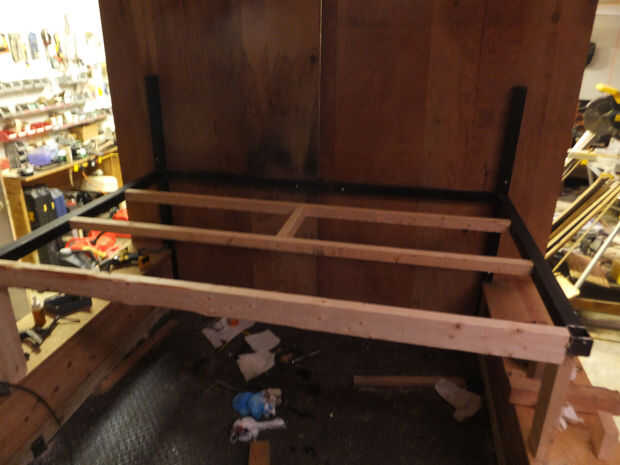 i utiliza la jaula de acero existente, apoyados con abeto sin tratar 2 x 4, había enmarcado dentro con las piceas del mismo. capas de corte 1/2 '' a la anchura de su remolque, menos una pulgada. Centro en el marco. en retrospectiva, debo haber atornillado en rodajas-en-mitad 2 x 4 a lo largo de los bordes cortos del capas antes de atornillar abajo, sería más fácil de fijar a las paredes laterales más adelante.