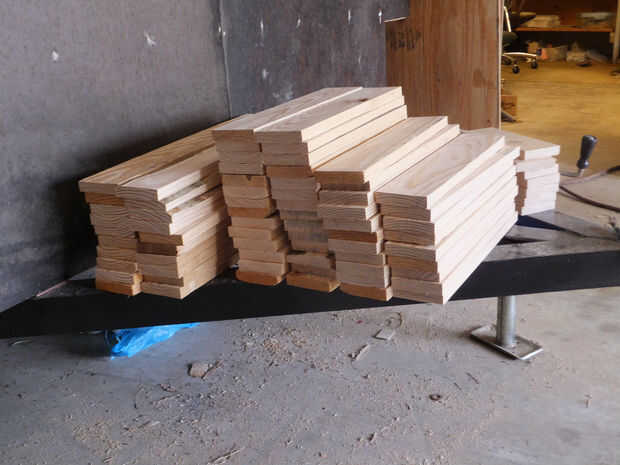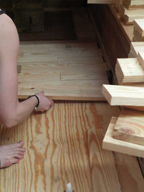 quería que la belleza y la durabilidad de un piso de madera, sin el costo. tuvimos 50 pies cuadrados, pero con piso de madera fabricado en $2-5 pies cuadrados, esto no estaba en el presupuesto, sobre todo porque tienes que comprar mínimo 100 pies cuadrados en un montón de lugares. el hábitat restauración tenía algunos casos parciales, pero todavía estaba $1,50 un pies cuadrados y no muy bien. así que mi solución era esto: compramos madera de pino sin tratar localmente molido, era algo como 3/4 '' x 3 x 12. tenemos el grado con albura en él (creo que se ven cool y su más barato). salió a 39 centavos de dólar por pie cuadrados y se ve fantástico!