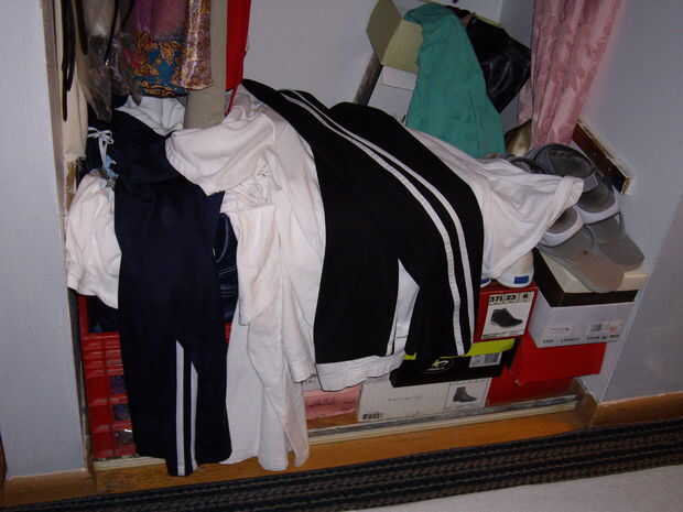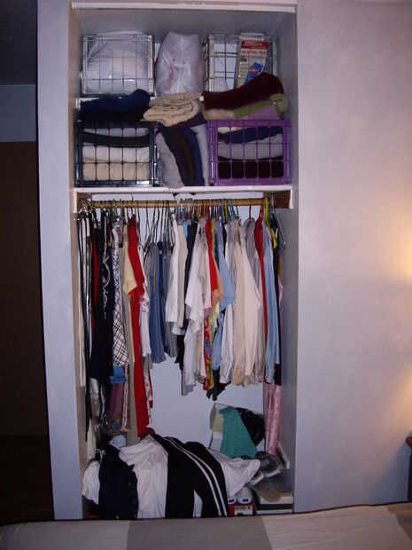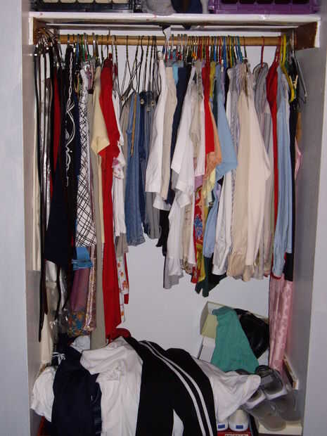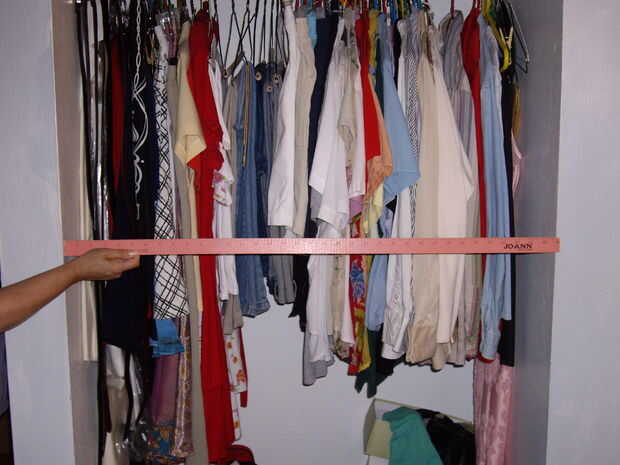¿El gran problema en nuestra casa? Los armarios. Cuatro de ellos, 36" de ancho por 35" profundo. Uno es para la ropa de señora M (y ella no es tendedero). Una es nuestra despensa en el nivel inferior (sin sótano, otra razón que el arquitecto debe sufrir por sus pecados). Realmente utilizar un tocador separado para mi ropa. Los otros dos son gotas fi gura.