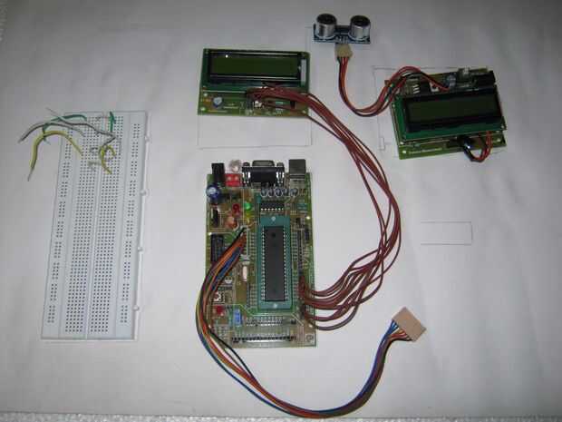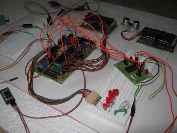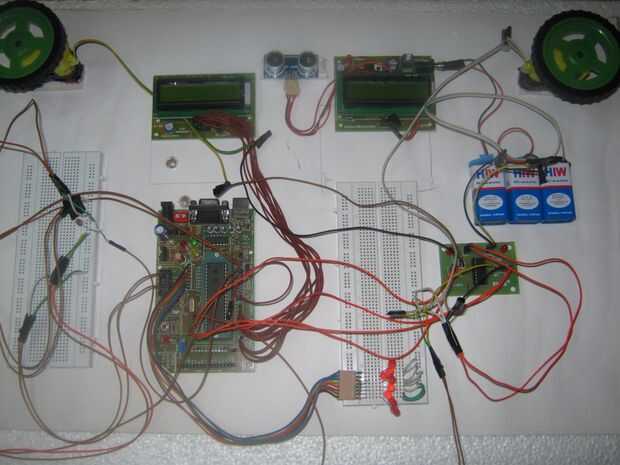 Después de toda la parte de programación, era tiempo para probar cada módulo y arriba son las fotos de cómo he conseguido conectados sensores al MCU, proveí ATMega8 con alimentación de batería y estaba tan pilas 12v 1A adaptador para ATMega16.