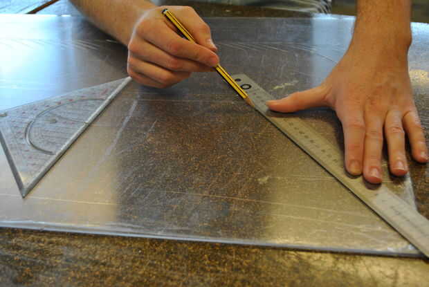 El primer paso es hacer los triángulos de las hojas de plástico (PS). Para ello, necesita un lápiz, regla, transportador y un cortador.