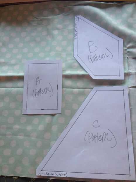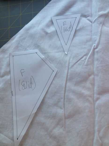 Recuerde, usted quiere cortar A B y C en la tela del vestido, D en la tela del cuello y E y F en la tela de fondo. Cortar dos de cada pieza excepto E. y siempre cortar a la tela con el encarando los derechos juntos.