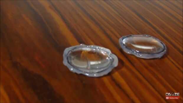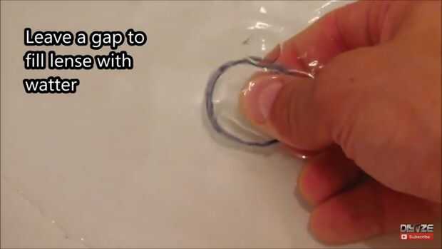 Ahora pegue dos círculos juntos por lo que es una copa de aire entre ellos. Utilice pegamento caliente y pegamento con cuidado los bordes alrededor de los círculos. Deje un agujero para que puede llenar tu lente con agua como se muestra en las fotos. O Ver VIDEO. A continuación rellenamos el agujero con pegamento caliente más. Asegúrese de que la lente está bien sellada y no salga agua, si, trate de encontrar la fuga por lente sumergir en el agua y ver de dónde vienen las burbujas. Hacer lo mismo con otro lente. Tienes dos ojos y necesita dos lentes.