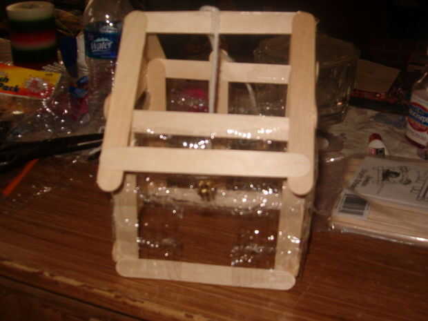 necesita ocho palos jumbos y la pistola de pegamento otra vez, y la cadena y la campana, se cortan la parte superior de la botella plástica de agua y la parte inferior de él también. Luego corte el verticlebottom de la botella superior, luego corte horizontales dos a tres pulgadas de la misma. pegamento las pulgadas de la botella a la estructura. entonces en el truss puede hace un cuadrado y encolarlos. puede hacerlo en el mismo lado y no te olvides de hacer una puerta para que el pájaro puede entrar.