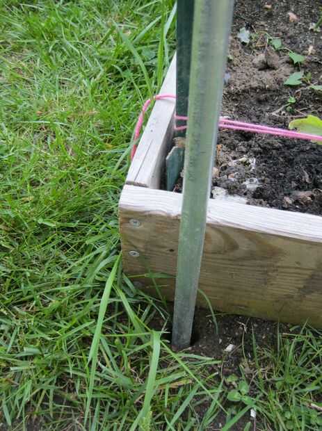 He planteado camas y he instalado los aros en la parte exterior de la cama. Da un poco más de espacio a las plantas, y los aros no están empujando la cama aparte. Hace cortar el pasto un poco complicado, pero no me importa.