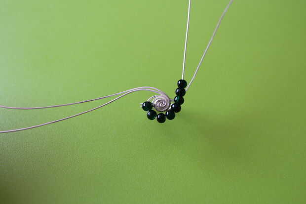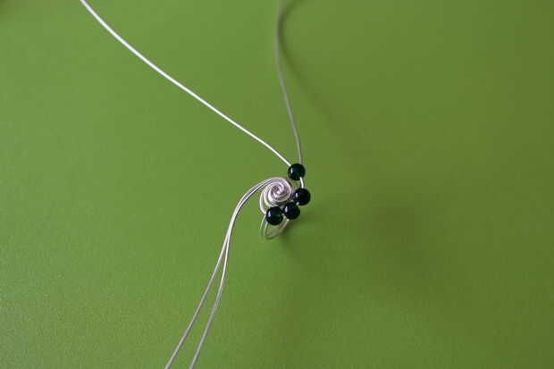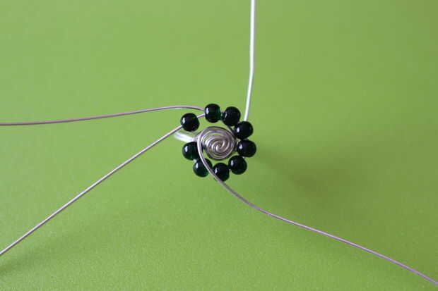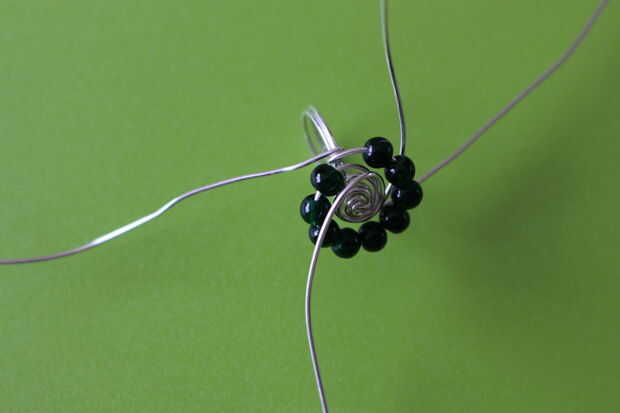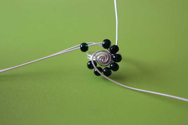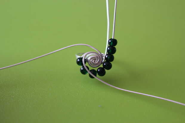 Tome el anillo del mandril y comenzar a agregar cuentas a uno de los alambres exteriores. El número de granos que necesitarás depende un poco del tamaño del círculo que envuelto durante el último paso. Lentamente doble el cable moldeado alrededor del círculo. Una vez sobre a medio camino a través de, empezar a doblar el alambre interior en el otro lado hacia el círculo. Esto se utilizará para hacer el círculo en el paso siguiente. Sigue doblando el alambre con cuentas hasta llegar a la base del anillo y completar el círculo. Enrolle el cable alrededor de la base, cortar el extremo y fijarlo con la abrazadera hacia abajo.