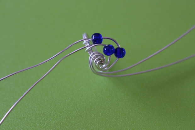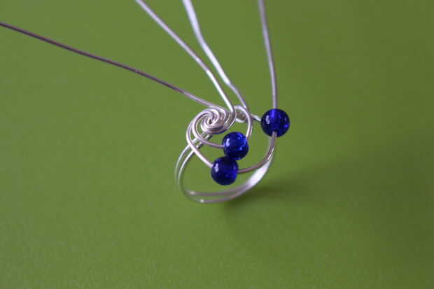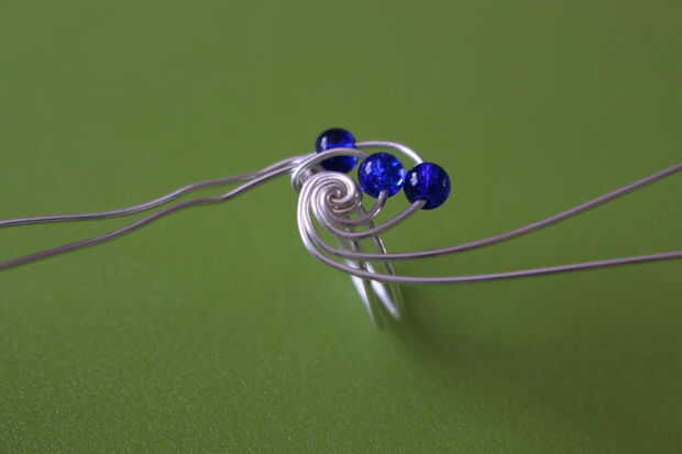 Añadir un grano a uno de los alambres internos y dos cuentas en el alambre externo del mismo lado. Asegúrese de que una de las perlas en el alambre externo termina en un lado de la cuenta individual y el otro grano en el otro lado. Una vez que los tres están en posición, envuelva el cable alrededor de la base del anillo interior y exterior, pero no cortan apagado todavía.