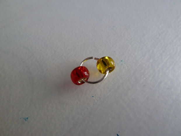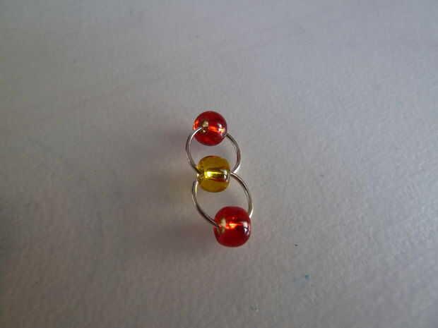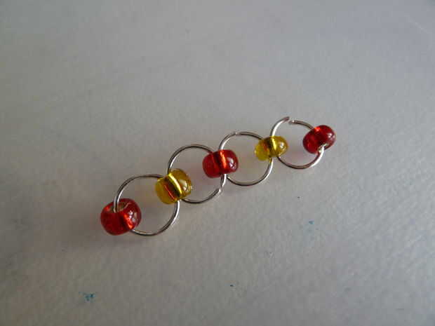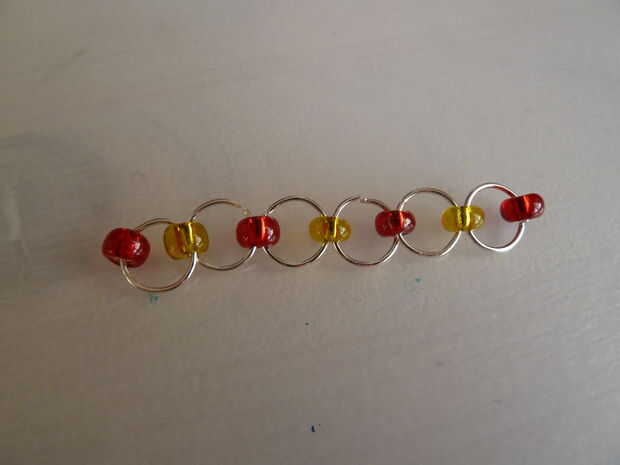 Tome uno de los anillos del salto que hizo último paso y abrirlo. Añadir dos granos, si utilizas dos colores de abalorios, uno de ambos colores. Cerrar el anillo del salto. Un segundo anillo del salto y añadir a uno de los granos. Mientras todavía está abierto, coloque una capa en el color correcto. Repetir esto para crear la pulsera. Terminé con 15 perlas.