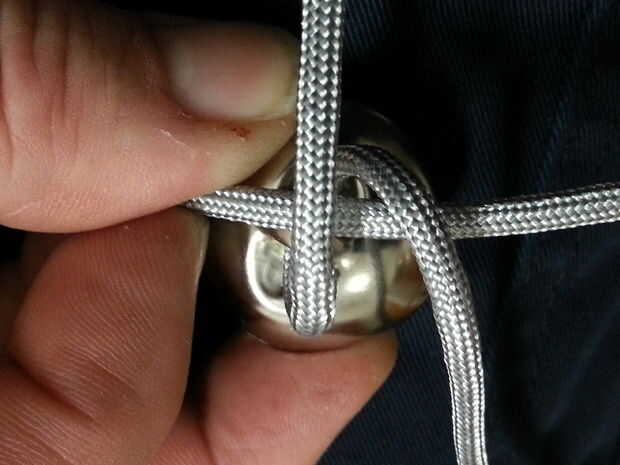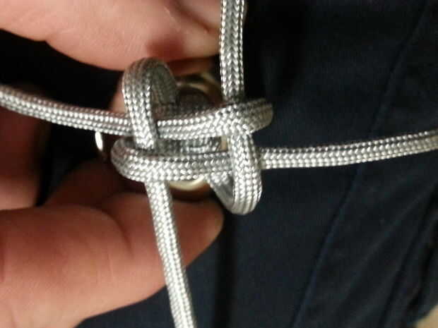 Esto se hace con un simple nudo de caja. Primer lugar la primera campana en una sola pieza de cable correcto en medio de ella. Coloque la segunda pieza de cuerda sobre el primero. Ahora puede empezar su nudo de caja. Lo más importante es tomarse su tiempo. He intentado mostrar el nudo bien en las fotos. Deben ayudar los tres primeros cuadros, Foto 4 es el nudo apretado para arriba. A continuación ate otro 1 o 2 nudos. En este momento sólo hice un extra, así que 2 nudos.