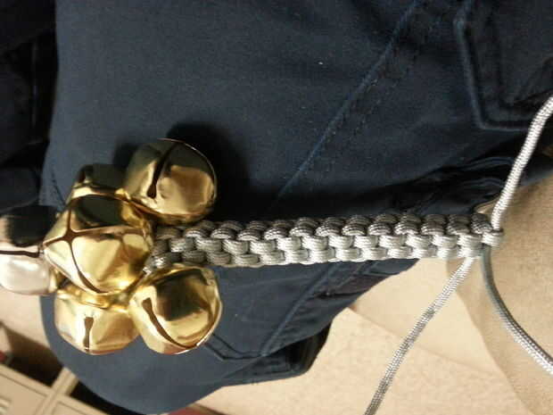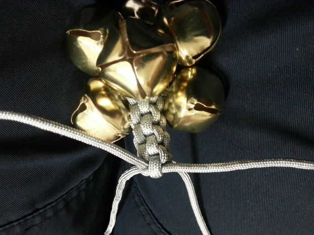 Continuar haciendo nudos de caja hasta que el mango es la longitud que desee. Fui a 4 1/2 pulgadas desde el último conjunto de campanas. Eso me dejó cerca de 3 pulgadas para cortar cada línea hasta el final. Desea esta altura así que usted puede apretar nudos bien. Tómese su tiempo, como se hace esto para asegurarse de que cada nudo es tan cómodo como usted puede conseguir. Recuerde el más mejor saldrá al final de tus nudos.