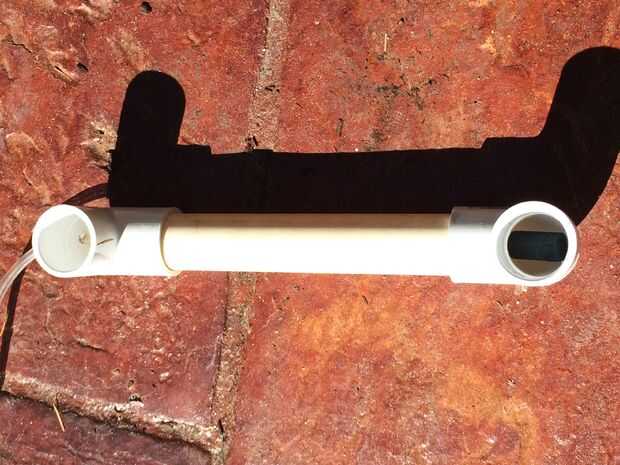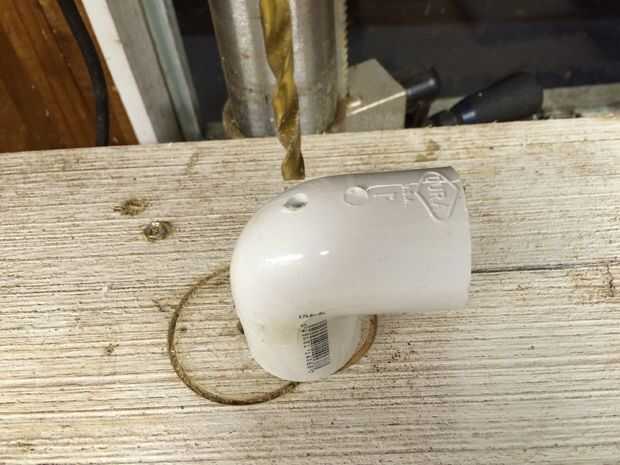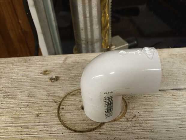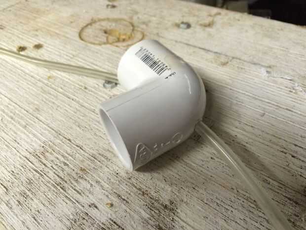 Ahora perfore un agujero en la parte superior de uno de los codos, el tamaño del tubo de aire. Luego enrosque el tubo en él. Se trata de la parte superior de la bomba. Esto encaja en la tubería, asegurándose de que el tubo de aire pasa a través de todo el camino hasta el otro extremo.