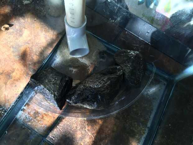 Corte alrededor de un tercio de la bandeja de agua alrededor del borde (si estás poniendo la cascada en el centro del tanque, cortar por la mitad), dejando aproximadamente 2 pulgadas de plástico alrededor de la base. Coloque en la esquina del tanque como se muestra en la figura 2. Ahora colocar piedras alrededor del borde para mantener en su lugar como se muestra en la figura 3.