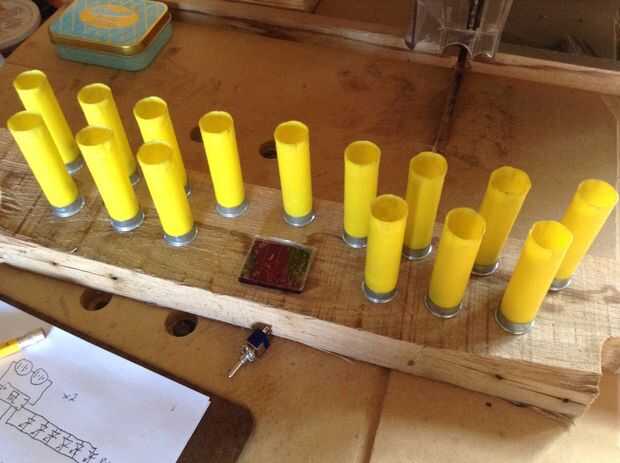 Después de la limpieza exterior escritura y residuos de pólvora desde el interior de las cáscaras de la escopeta, organicé los componentes que planeaba usar en una porción limpia de un larguero de plataforma. Quería incorporar un elemento solar de la lámpara que se encendían dos LEDs a cada lado del interruptor para iluminar donde está el conmutador y posiblemente actuar como luz de noche, apagar cuando la lámpara regular fue convertida por y viceversa.