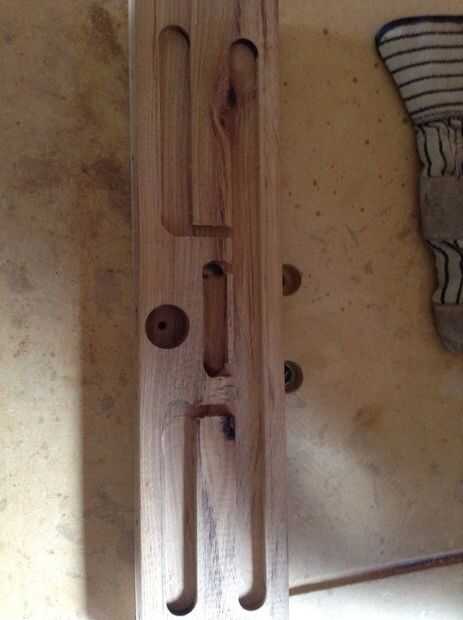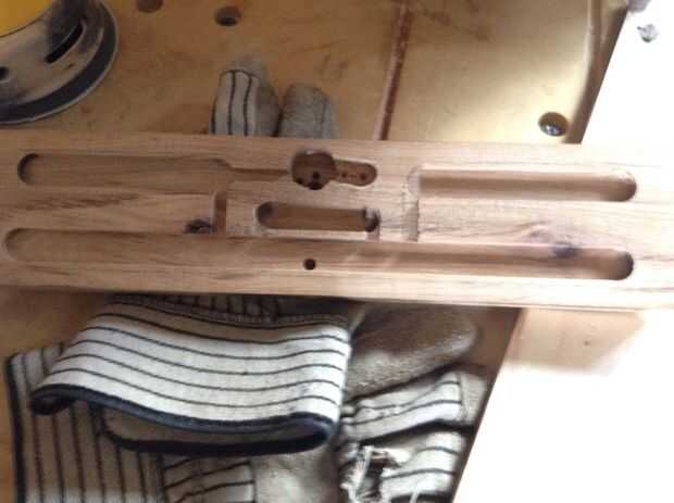 Usé mi router para cortar ranuras para el compartimiento de la electrónica en el más grande de los dos bloques de madera (cuerpo de la lámpara), volver a colocar los componentes en las ranuras periódicamente para asegurar el diseño y el ajuste apropiado. Utilizar 1 1/4 de pulgada broca Forstner, perforó un agujero para actuar como una caja para el interruptor, mirando hacia adelante, LED y conexiones de cableado para sentarse. Perforé un agujero perpendicular en este agujero de 1 1/4 de pulgada para el mecanismo de la palanca del interruptor, más adelante de enrutamiento una ruta para cables ejecutar desde este agujero con el resto del compartimiento de cableado. Luego amplié el compartimiento de interruptor por dos agujeros poco profundos con un pedacito de Forstner 5/8 para el tablero de conductor del LED y solar en.